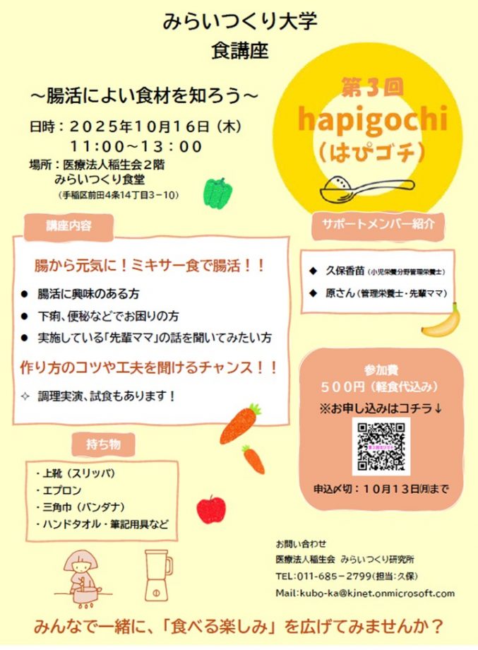 みらいつくり大学では、第3回食講座「hapigochi(はぴゴチ)」を開催いたします。