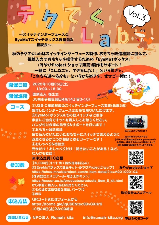 「どんな子どもにも可能性があることを伝えたい」「子どもたちの“できる”にみんなで寄り添っていきたい」、そんな思いでスイッチや視線入力などAT(アシスティブテクノロジー)の普及に尽力するNPO法人Rumah kita代表の吉田美知代さんは、自身も重症心身障害を持つ子どものお母さんでもあります。我が子も含め、たくさんの子どもたちの可能性を広げてきた経験を持つ吉田さんが、親御さんや支援者の皆さんの「誰に聞けばいいんだろう?」に応えるために開催しているイベントがテクてくLabです。スイッチやインターフェース等の製作指導だけでなく、おもちゃの改造相談、活用方法のアドバイス、見学やおしゃべりだけ…などなど、どなたでもどんなご相談でも歓迎です。
