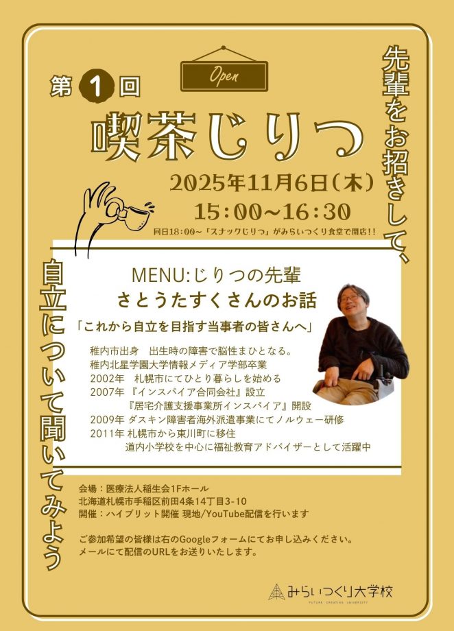 みらいつくり大学では「じりつ」について気軽に語ったり聞いたりする場を、「喫茶じりつ」「スナックじりつ」としてオープンいたします。