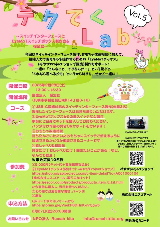 「どんな子どもにも可能性があることを伝えたい」「子どもたちの“できる”にみんなで寄り添っていきたい」、そんな思いでスイッチや視線入力などAT(アシスティブテクノロジー)の普及に尽力するNPO法人Rumah kita代表の吉田美知代さんは、自身も重症心身障害を持つ子どものお母さんでもあります。我が子も含め、たくさんの子どもたちの可能性を広げてきた経験を持つ吉田さんが、親御さんや支援者の皆さんの「誰に聞けばいいんだろう?」に応えるために開催しているイベントがテクてくLabです。スイッチやインターフェース等の製作指導だけでなく、おもちゃの改造相談、活用方法のアドバイス、見学やおしゃべりだけ…などなど、どなたでもどんなご相談でも歓迎です。