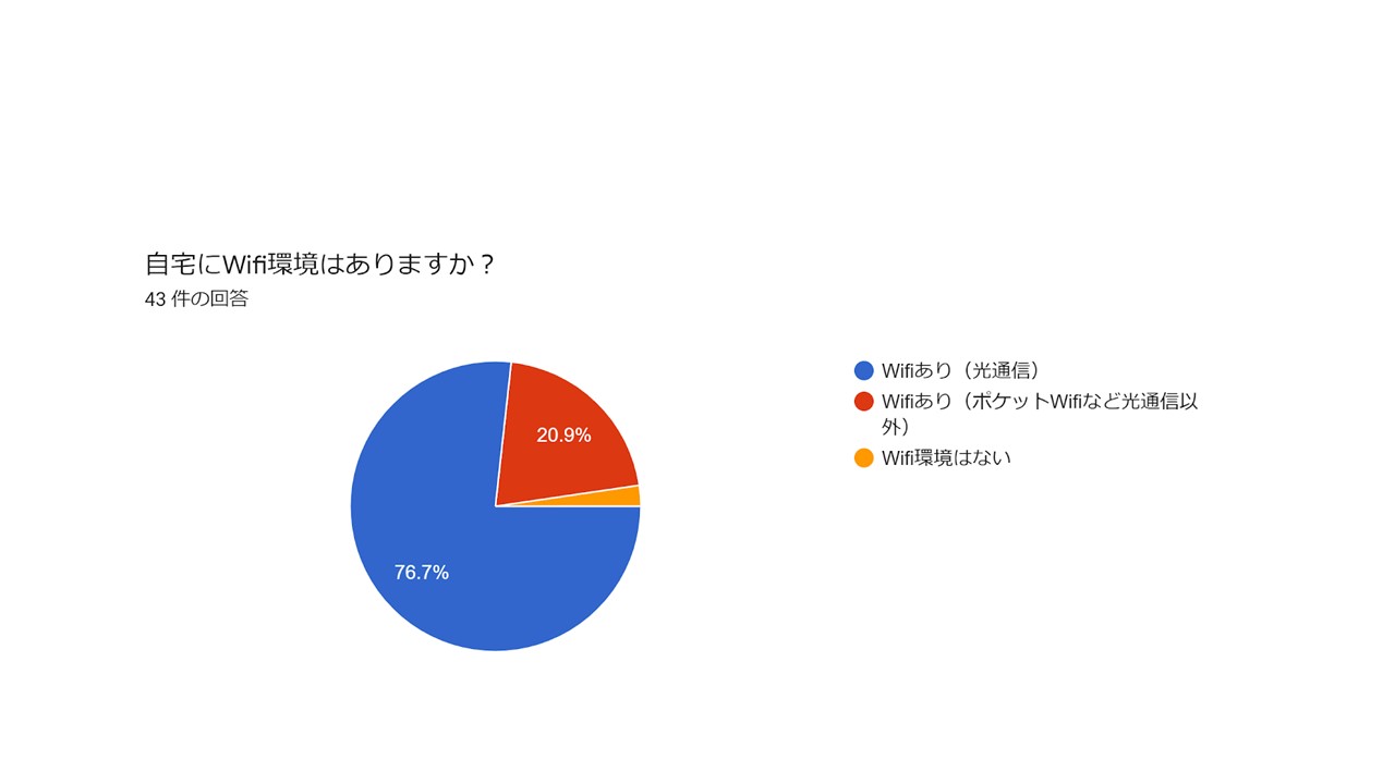 単一選択肢は円グラフになる。4人に3人が、自宅に光通信の環境があった。Wifi環境が無い職員については、必要に応じて法人のポケットWifiを貸与した。