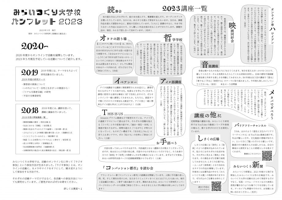 少しずつ増えてきた活動の一覧を作成するため、2023年度版の案内パンフレットを作成しました。